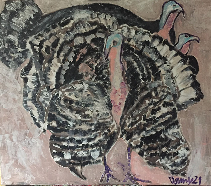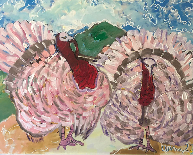 Pink turkeys (i tacchini rosa del parco Pertini) (acrilico su tavola 50x60 2023)
