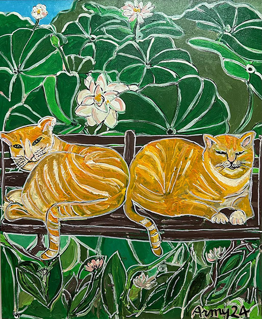 Loto e gatti rossi (acrilico su tavola 50x60) 2024
