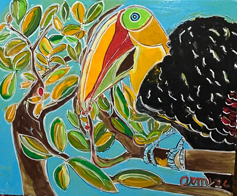 Autunno sul mio albicocco con tucano (acrilico su tavola 50x60) 2024