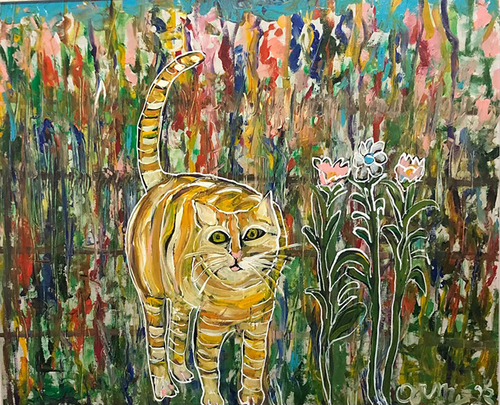 Miscela di fiori e gatto rosso (acrilico su tavola 50x60 2023)